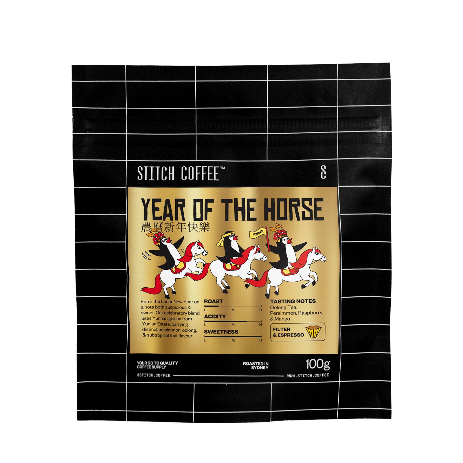Introducing our premium omni-roast blend featuring geisha from Yunnan, China! A celebration of Chinese flavour, Year of the Horse carries distinct hints of oolong tea and persimmon, with sub-tropical fruit elements on the finish. Enjoyable both as espresso or pour-over.